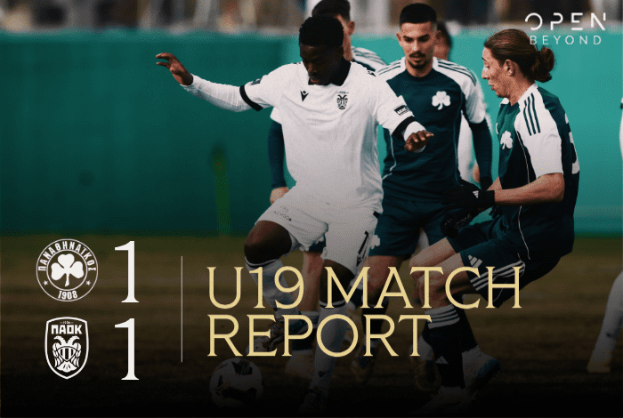 Η Κ19 αναδείχτηκε ισοπαλία 1-1 με τον Παναθηναϊκό στο ματς της 10ης αγωνιστικής της Super League, που έγινε στην Αθήνα το μεσημέρι της Κυριακής. Ο ΠΑΟΚ παραμένει πρώτος με 28 βαθμούς σε 12 παιχνίδια, έναντι 26 του Παναθηναϊκού σε 13 ματς και 25 του Ολυμπιακού, επίσης σε 12 αγώνες.