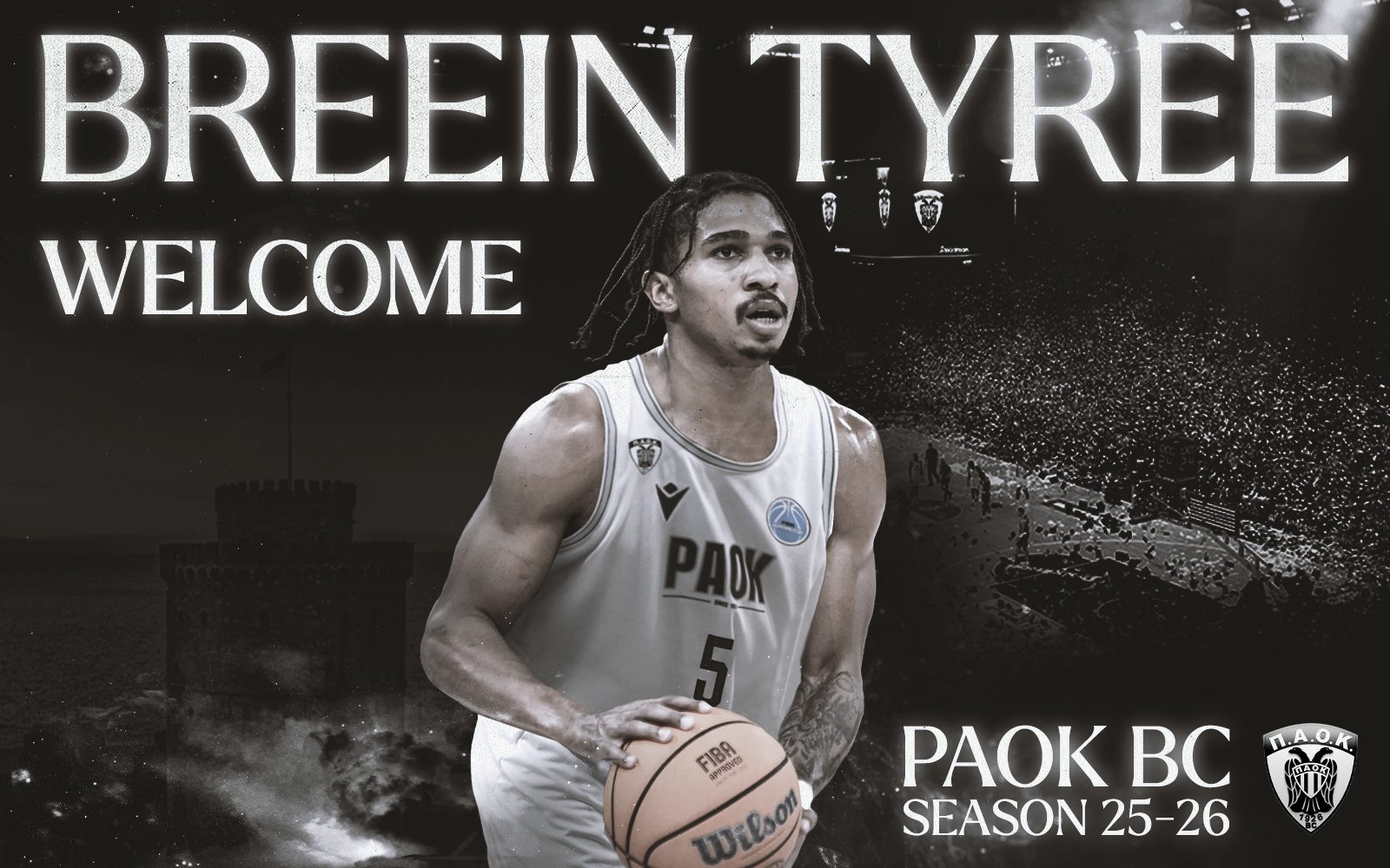 Η ΚΑΕ ΠΑΟΚ ανακοινώνει τη συμφωνία με τον Αμερικανό καλαθοσφαιριστή Breein Tyree, ο οποίος θα ενισχύσει την προσπάθεια της ομάδας μας ως το τέλος της αγωνιστικής περιόδου 2025-26.