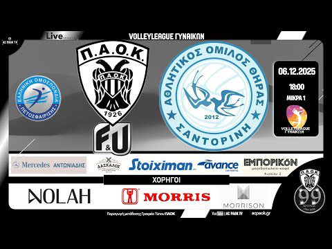 🏐 Για την 8η αγωνιστική της VOLLEYLEAGUE ΓΥΝΑΙΚΩΝ 2025-26, ο ΠΑΟΚ F&U υποδέχεται το Σάββατο 06 Δεκ 2025 και ώρα 1800, στο Γυμναστήριο ΜΙΚΡΑ 1 την ομάδα του ΑΟ ΘΗΡΑΣ.