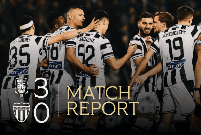 Από την άλλη πλευρά ο Λεβαδειακός προσπάθησε σε σημεία του πρώτου μέρους να γίνει απειλητικός, αλλά η ασπρόμαυρη άμυνα δεν άφησε περιθώρια, με τον Τσιφτσή να μπλοκάρει μία κεφαλιά του Βήχου στον στόχο στις καθυστερήσεις.